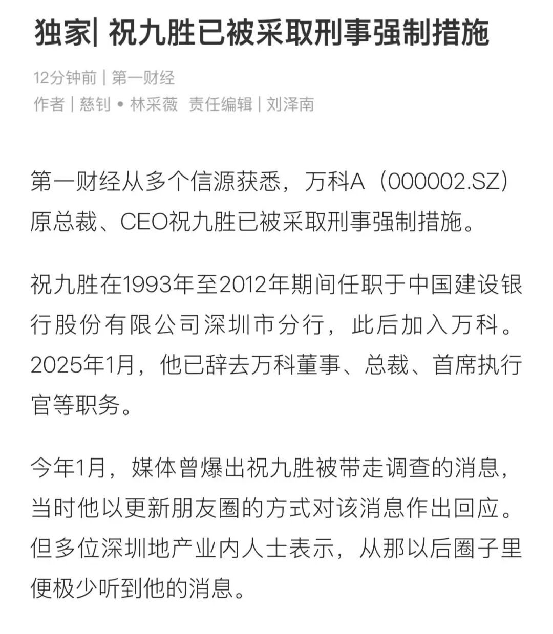 继万科董事长辛杰传出被查传闻、辞职后,万科原总裁、CEO祝九胜也被曝已被采取刑事强制措施!